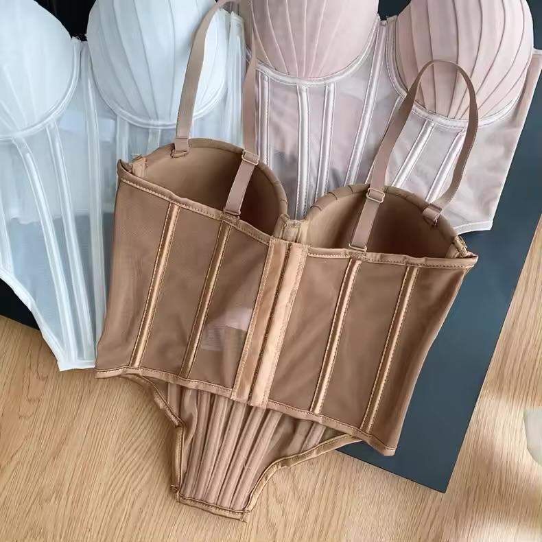 Elevate your style with these pleated mesh bustier tops, designed to make a statement. Featuring a structured design with padded cups and sheer detailing, these tops offer a perfect combination of support and sophistication. The pleated texture adds a unique touch of elegance, making them ideal for both casual outings and special occasions. Pair them with high-waisted bottoms, skirts, or layered under a blazer for a trendy and versatile look. Perfect for anyone looking to add a bold, fashionable piece to their wardrobe.